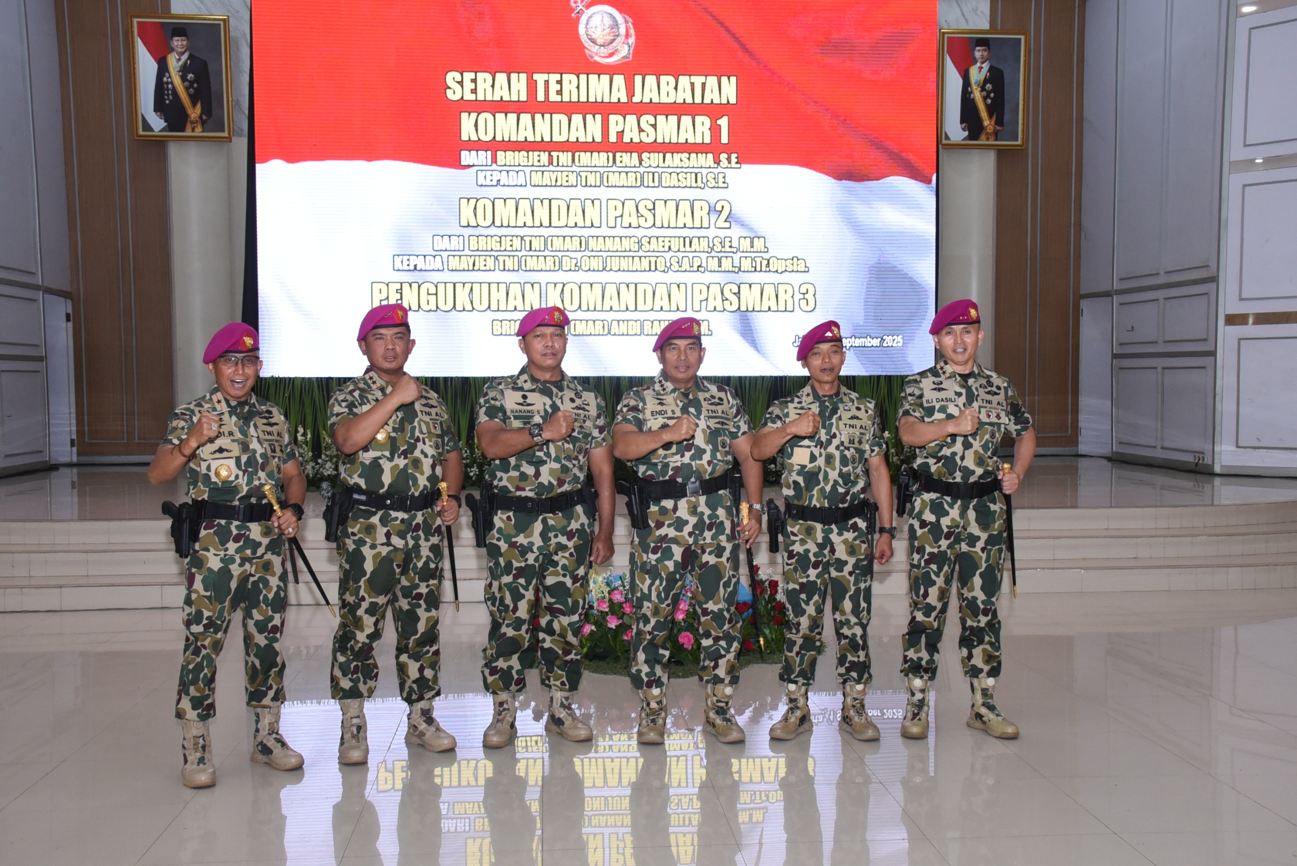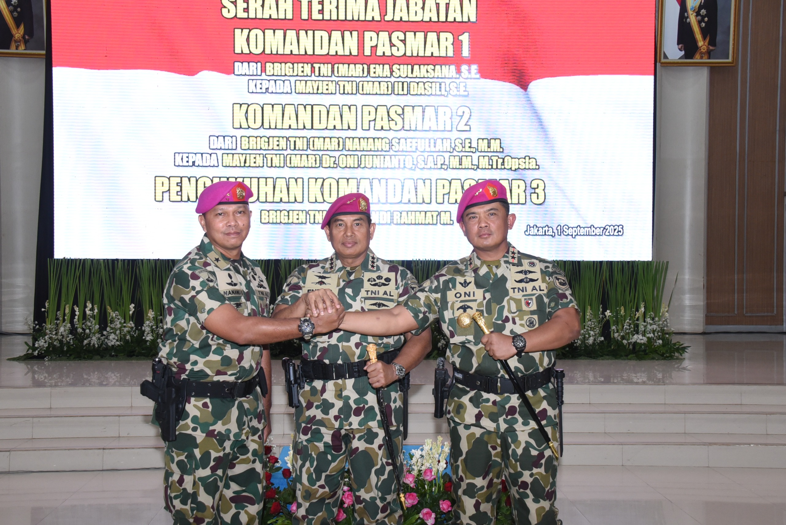 Dispen Kormar TNI Angkatan Laut (Jakarta). Panglima Korps Marinir (Pangkormar) Letnan Jenderal TNI (Mar) Dr. Endi Supardi, S.E., M.M., M.Tr.Opsla., CHRMP., CRMP., memimpin langsung Upacara Serah Terima Jabatan (Sertijab) Komandan Pasmar 1 dan Pasmar 2 serta pengukuhan Komandan Pasmar 3 yang digelar di Gedung Graha Korps Marinir, Jalan Prajurit KKO Usman dan Harun No. 40, Kwitang, Jakarta Pusat, Senin (01/09/2025).