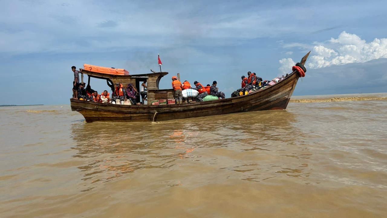 Sebelum keberangkatan, prajurit terlebih dahulu melaksanakan korve logistik dari KRI SHS-990 ke kapal nelayan. Proses pemindahan bantuan berjalan cepat dan teratur, mulai dari kebutuhan pokok, selimut, hingga perlengkapan medis. Para prajurit bekerja bahu-membahu memastikan seluruh paket tiba dalam kondisi aman.