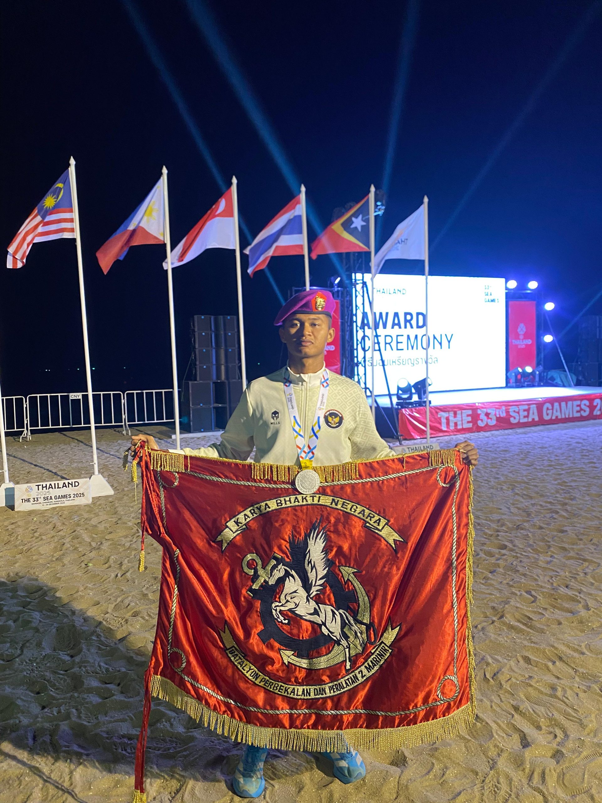 Berita Komando (Jakarta). Prajurit petarung Korps Marinir TNI Angkatan Laut kembali menorehkan prestasi membanggakan pada ajang SEA Games XXXIII Tahun 2025 yang digelar di Bangkok, Thailand. Kali ini, Sertu Marinir Ifsan, prajurit Pasmar 2, berhasil mempersembahkan medali perak bagi Kontingen Indonesia pada cabang olahraga Modern Pentathlon, nomor Men’s Obstacle Laser Run Individual, Jumat (19/12/2025).